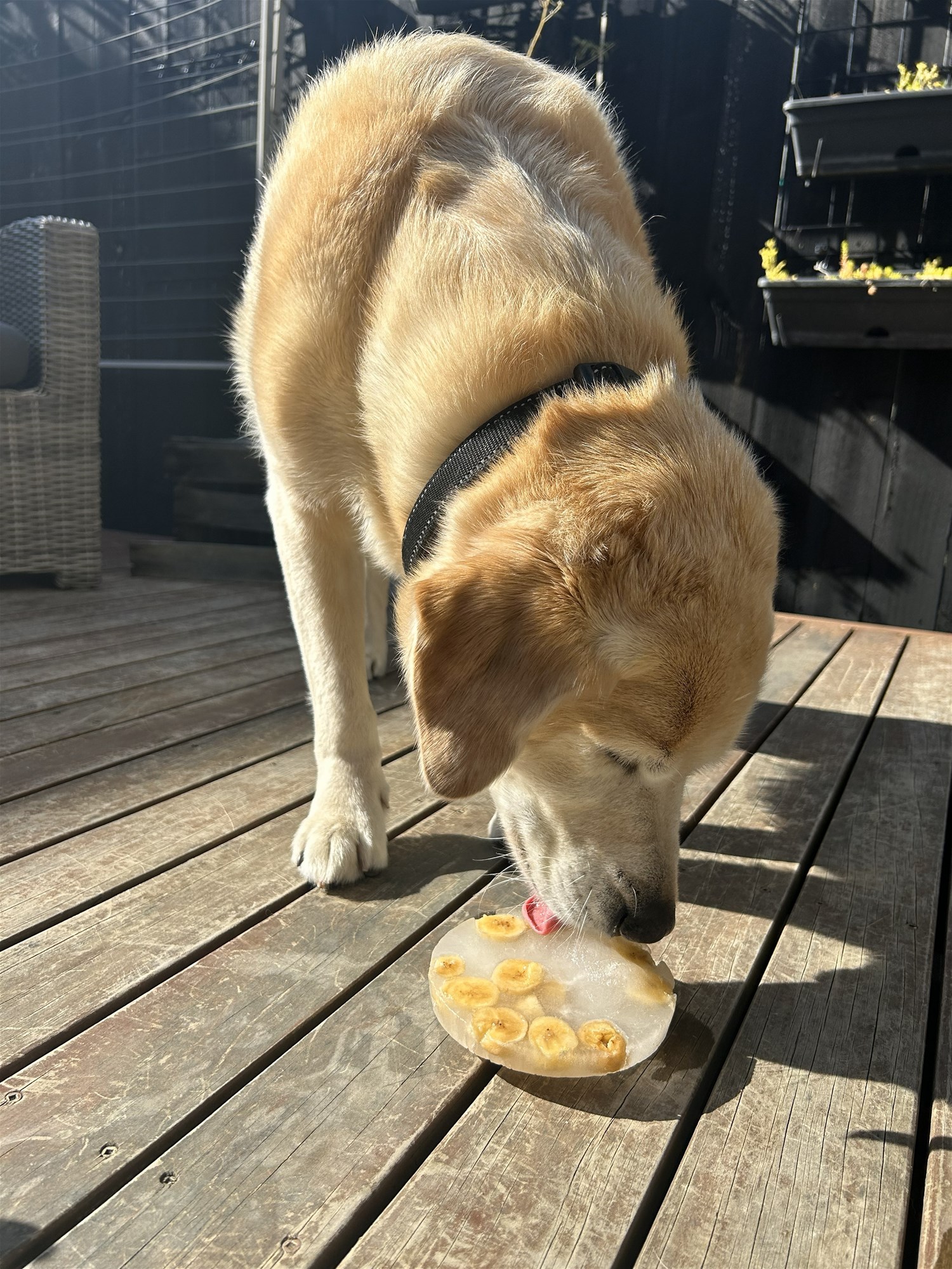 You can ask your parents or caregivers if you can make doggy ice blocks. You can do this by freezing water with dog biscuits inside or even choose from the suggestions below.